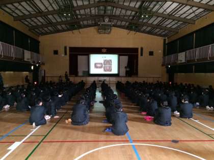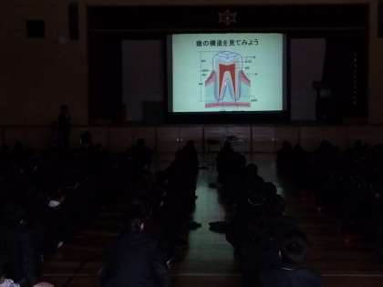 1年生の6時間目で、講師の方をお招きして、歯と口の健康教室が開かれました。虫歯になるまでの過程や、正しい歯磨きの仕方などを学びました。虫歯や歯肉炎を患った患者の実際の映像を目の当たりにし、「なりたくない!」という気持ちのこもった驚きの声が上がりました。