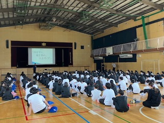 一泊移住の説明会では施設の紹介や、取組内容についてのお話がありました。最後に、学年主任の日渡先生から、「時を守り 場を清め 礼を尽くす」という言葉の紹介がありました。入学からの日々を振り返るとともに、一泊移住を通して、さらに成長していってほしいという意味を込めてのお話がありました。