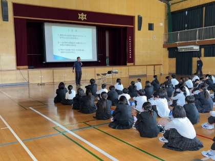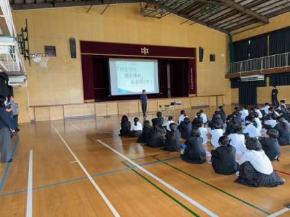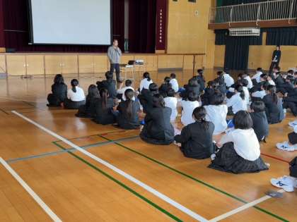 本日、1年生は体育館にて一泊移住の説明を行いました。亘先生から、「3つのしっかり」のお話がありました。「3つのしっかり」とは、「しっかり学ぶ」「しっかり楽しむ」「しっかり気づく」です。この言葉を実践してながら、仲間との絆を深め、思い出に残る行事にしていきましょう。