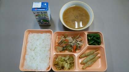 豚肉のしょうがじょうゆ炒め・きびなごてんぷら・キャベツのおかか炒め・三度豆のおひたし・みそけんちん汁・米飯・牛乳