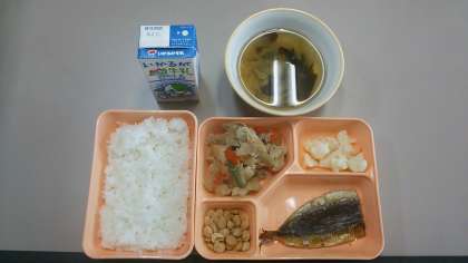 鰯のかば焼き・豚肉と野菜の煮もの・カリフラワーの柚子の香あえ・福々豆・すまし汁・米飯・牛乳