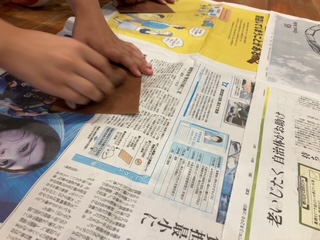 木工クラフト体験で、スプーンづくりです。まずは木をやすります。みんな必死です。