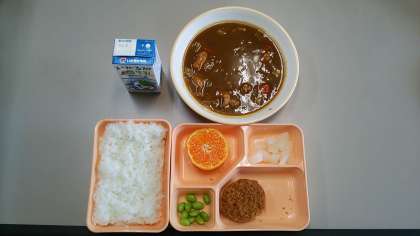 チキンカレーライス・枝豆・ミンチカツ・だいこんのサラダ・みかん・米飯・牛乳