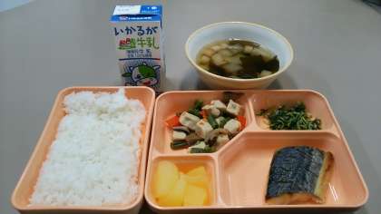 さごしの塩焼き・高野どうふの含め煮・水菜のおひたし・りんご缶詰・すまし汁・米飯・牛乳