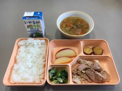豚肉の辛みそ焼き・はくさいの中華煮・さつまいものから揚げ・チンゲンサイの炒めもの・りんご・米飯・牛乳