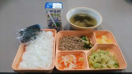 ビビンバ(肉炒め、チンゲンサイ、ナムル)・キャベツと枝豆の炒めもの・パインアップル缶詰・とうふのスープ・米飯・牛乳