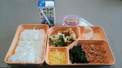 三色丼(鮭そぼろ、ほうれん草、錦糸卵)・菜の花とちくわのてんぷら・だいこんの酢のもの・ゼリー・米飯・牛乳