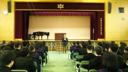 卒業式の予行前、3年生は体育館で同窓会への入会式を行いました。