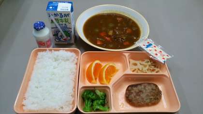 ハンバーグカレーライス・ブロッコリー・れんこんサラダ・清見オレンジ・はっ酵乳・米飯・牛乳