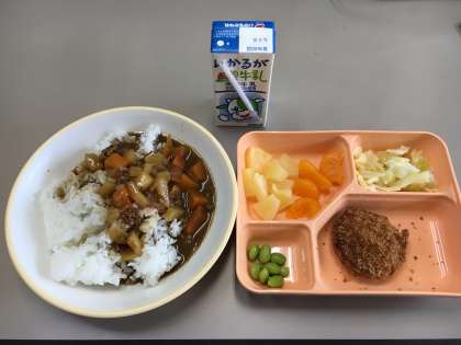 カツカレーライス(一口カツ、枝豆)、キャベツのピクルス、フルーツミックス、牛乳