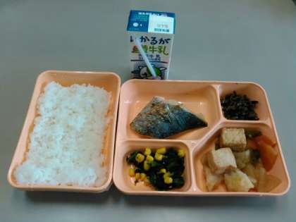 さごしの塩焼き、厚揚げとジャガイモの煮もの、ほうれん草とコーンのおひたし、牛ひじきそぼろ、ごはん、牛乳