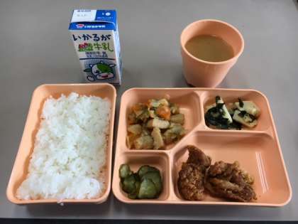 鶏肉の竜田揚げ、いかと野菜の炒めもの、若竹煮、きゅうりの酢のもの、味噌汁、ごはん、牛乳
