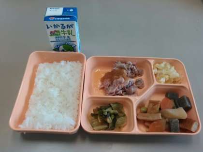 豚肉のおろし醤油焼き、赤平天とこんにゃくの煮もの、おおさかしろなの炒めもの、キャベツの甘酢あえ、ごはん、牛乳