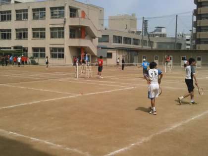 大阪市春季総体第三ブロック予選が、本校を会場に行われました。本校は男子が参加39ペア中の21ペア、女子が参加50ペア中の6ペアが出場しました。試合の結果は、ベスト13を争って、男子1位、3位、5位、9位、9位、13位に6ペアが入賞して市大会への出場権を得ました。女子ではベスト9までの出場権をめざし、本校は2位と3位に入賞した2ペアが市大会へ出場することになりました。応援にかけつけていただいた保護者のみなさん、ありがとうございました。