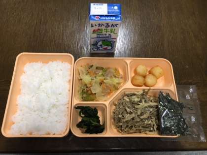 鶏ごぼうご飯(きざみのり付き)、ツナと野菜の炒めもの、揚げポテトもち、ほんれんそうのおひたし、牛乳