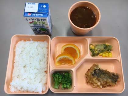 ビーフシチュー・ブロッコリー 、白身魚のから揚げ 、レタスとコーンのサラダ 、清見オレンジ 、米飯 、牛乳