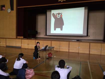 1日目昼食の「くまもん弁当」の説明をしているところです。