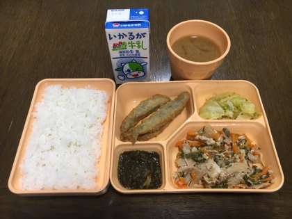 豚肉の甘辛炒め いわしてんぷら キャベツのごまあえ のりの佃煮 みそ汁 米飯 牛乳
