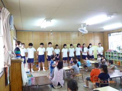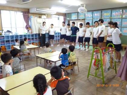 6月9日2限目、3年4組の生徒が家庭科の保育体験で、大浪保育所の幼児たちとふれあいました。