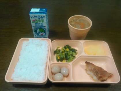 八宝菜・うずら卵 赤魚の中華焼き チンゲンサイの炒めもの りんご缶詰 米飯 牛乳