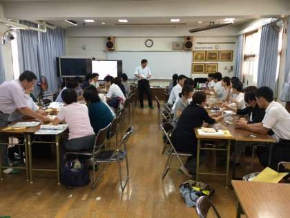 7月22日午後、本校多目的室に大阪市の中学校理科教員30名が集まり、実験等についての研修会が開催されました。4〜5名ずつの班に分かれて、真剣な眼差しで取り組んでいました。