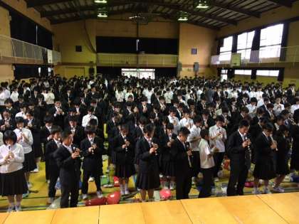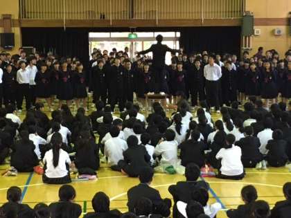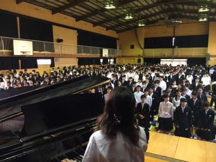 体育館に全校生徒が集まり、校歌・大阪市歌の斉唱、ふるさとの合唱、カノンのリコーダー合奏、各学年の学年合唱を行いました。いよいよ明日が本番、頑張ってほしいものです。