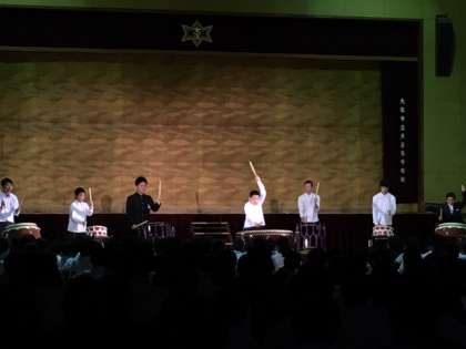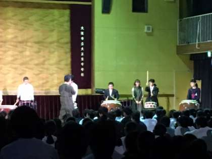 生徒の和太鼓体験もさせていただきました。11人の生徒が様々な太鼓を一斉に打ち鳴らしました。