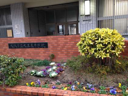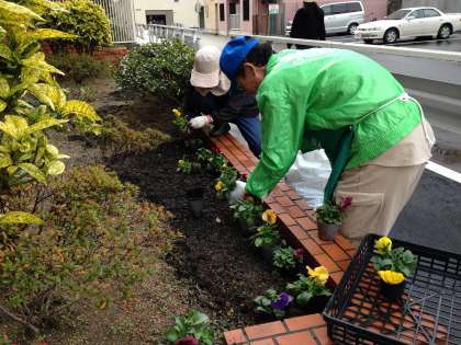 緑化活動支援として、9月から緑化ボランティアの方々に正門前花壇に花を植えてもらっています。写真は12月20日(金)にパンジーとビオラに植え替えをしていただいているところです。