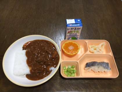ハヤシライス・枝豆 白身魚のムニエル カリフラワーのピクルス みかん 米飯 牛乳