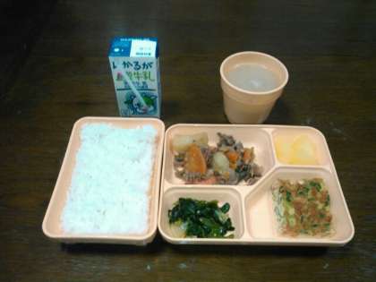 肉じゃが 千草焼き ほうれん草とはくさいのおひたし りんご缶詰 豚汁 米飯 牛乳