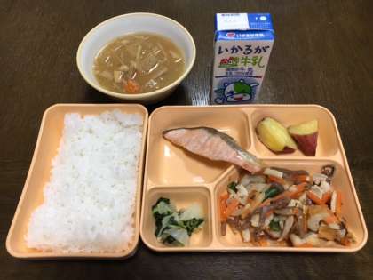 かやくごはん 鮭の塩焼き ふかしいも 小松菜とはくさいの即席漬け 豚汁 米飯 牛乳