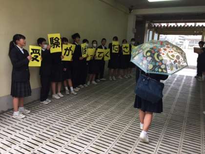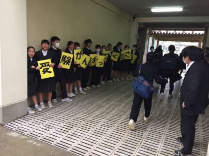 朝の登校時に通用門で明日の私立高校受験に向け、生徒会が中心となり「受験頑張ってくださ〜い!」と元気いっぱいの応援メッセージを送りました。3年生のみなさん頑張ってください。