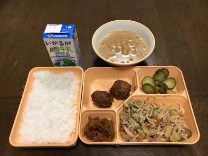 焼きそば 肉だんご きゅうりの酢のもの 福神漬け みそ汁 米飯 牛乳