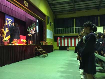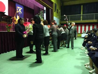写真は、卒業式後のPTAからの記念品贈呈と3年生所属の先生への花束贈呈の様子です。ありがとうございました。