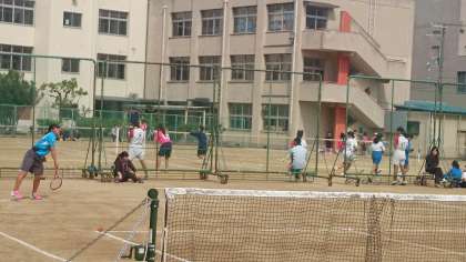 4月29日(土)に大阪市春季総体第3ブロック予選会の女子団体対戦が本校テニスコートで行われました。試合は3ペアずつのリーグ戦で行われ、本校は初戦で大正西に2−1、相愛に3−0で勝ち、港南に1−2、東に1−2、港に1−2と惜敗し、最後に大正北に2−1で勝って、3勝3敗の3位となりました。この結果、男子団体とともに6月3日(土)に長居庭球場で行われる予定の大阪市大会の出場権をえました。