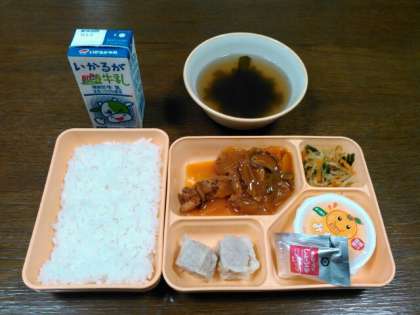 酢豚 シューマイ 野菜炒め みかんゼリー わかめスープ 米飯 牛乳