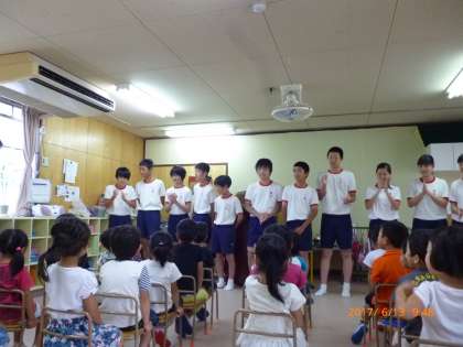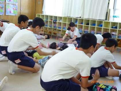 3歳から5歳の幼児たちと3年5組の全員が楽しい時間を過ごしました。「おいもの天ぷら」「イスとりゲーム」「絵本の読み聞かせ」をやりました。