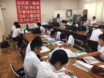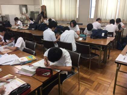 期末テスト一週間前となり、学校元気アップのテスト前自主学習会が始まりました。午後5時30分までみっちりと勉強しています。学習ボランティアの方も来ていただいて、質問に答えてもらっています。