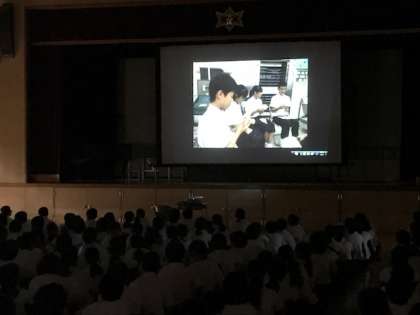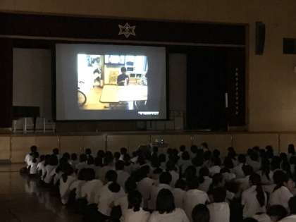 昨日、5時間目に体育館において、二年生の職場体験学習の記録写真をスライドショウにしてみんなで鑑賞しました。みんな、思い出もあり、楽しそうに見ていました。