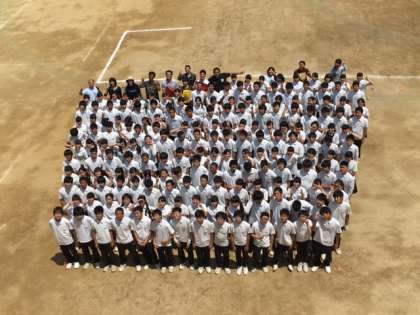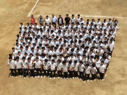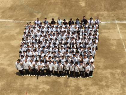 航空写真撮影に先だって全体写真を撮影し、その後学年別の集合写真を撮影しました。