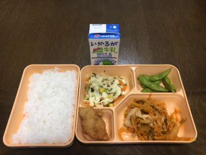 豚キムチ マカロニサラダ 枝豆 鶏肉のから揚げ 米飯 牛乳