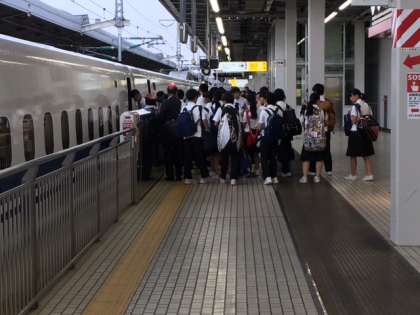 新大阪駅のホームです。新幹線に乗り込んでいます。