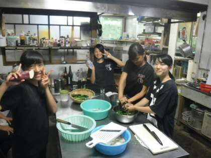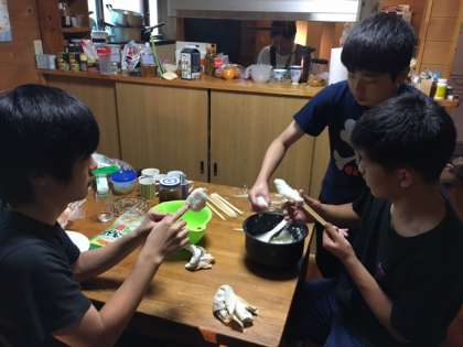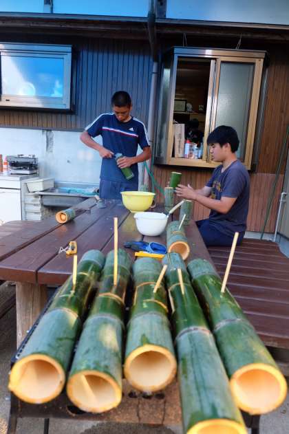五平もち作り、竹筒作りや野菜切りをしています。