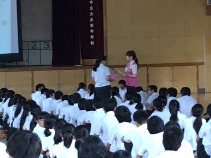 大正区保健福祉センターより保健師さんお二人にお越しいただき、プレゼンテーションを中心に、実際の赤ちゃんと同じ重さの人形を抱いてみたりしました。話の内容は、妊娠から性感染症へと話が進み、最後は小冊子を配布しエイズの話へと進みました。