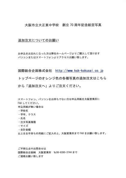 先日申し込みをしていただきました「航空写真」につきまして、追加注文の案内が届きましたので、お知らせします。
