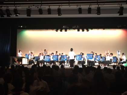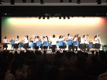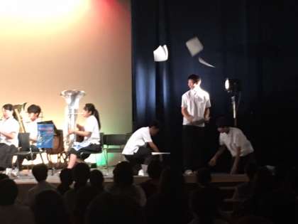 本校吹奏楽部も6番目に出演しました。1曲目はジャズの名曲「Sing Sing Sing」、2曲目はブルゾンM君が男子2人を従えて登場「Dirty Work」の曲にあわせて、ブルゾンちえみばりに笑いをとっていました。3曲目は恋ダンスの「恋」を演奏しました。一部恋ダンスの振りを取り入れるなど、とても楽しい演奏でした。