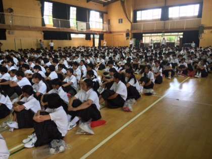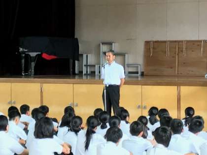 学校長より、夏休み中の安全生活がきっちりできたことや2学期の過ごし方の話があり、生活指導部長からは、創立70周年に向けて、学校の中が整備されてきれいにになったことや学校のものを大切にすること等の話がありました。