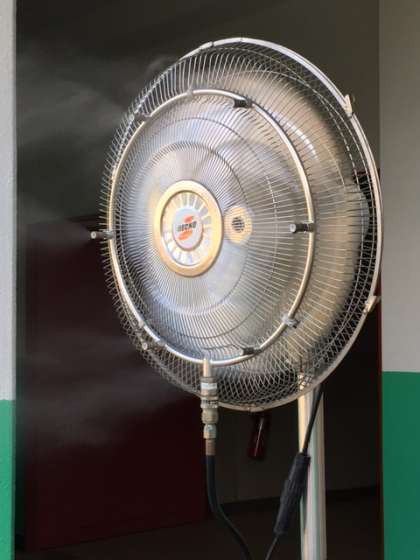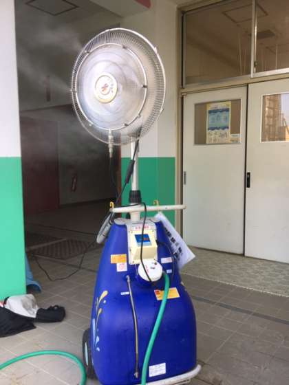 写真のように、ミストに送風機が付いたような機器です。実際に使ってみて、良ければ体育大会の時にも使いたいと思っています。