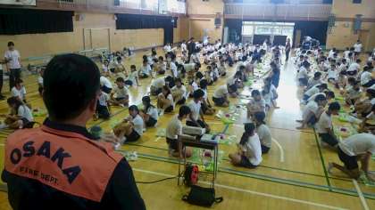 9月2日(土)に、土曜授業として全校で防災訓練を行いました。防災の担い手である中学生に、災害時の役割と救命救助法に関する知識と技術を習得させ、地域の防災力を高める目的で実施しました。消防署と大正区役所の方々及び校区の防災リーダーのみなさんの協力によって、充実した防災訓練となりました。