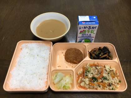 かつ丼(一口とんかつ) ひじきの煮もの キャベツの即席漬け みそ汁 米飯 牛乳